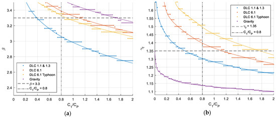 Figure 6 shows the optimal reliability index and safety factor if the discount rate is increased to . It is seen that the target reliabilities become smaller for a fixed value of , because failure consequences, potentially happening in the future, becomes less important when the rate is larger. Moreover, if the relative assessment is made here, a value is found for for DLC 6.1, and the optimal target reliabilities and safety factors will be almost the same as in Table 4.