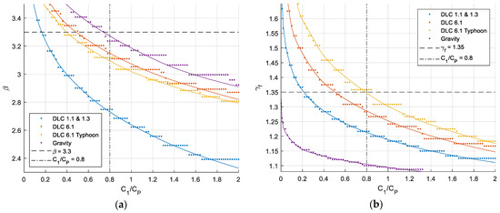 As it is difficult to assess the value of , a relative assessment is made. It seems appropriate to take DLC 6.1 as the starting point because the failure rate is almost constant over time, and the normal safety factor was found approximately to lead to a reliability index . According to Figure 4a, this target corresponds to the value , and this value is therefore used to find the optimal target reliability and load safety factor, which are shown in Table 4 together with the current values in IEC 61400-1 ed. 4 [5].
