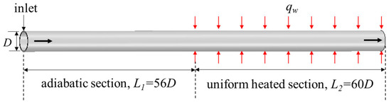 As shown in Figure 1, the calculation model is a straight circular tube with a diameter (D) of 5.87 mm. The total length is 680.92 mm, of which the first part (L1 = 56D) is adiabatic while the remaining (L2 = 60D) is heated by uniform heat flux. In terms of the boundary conditions, the inlet is set to ‘mass-flow-inlet’, the outlet is set to ‘pressure-out’, and the wall surface adopts a non-slip boundary. The parameters of the specific calculation case are shown in Table 1. The setting of heat flux in Table 1 is to obtain different Tw/Tb, so as to better explore the influence of gas variable properties. The flow setting of different gases is to keep the inlet Reynolds number consistent. It is noted that four helium–xenon gas mixtures of different molecular weights have been selected in previous studies [25,26], among which the He–Xe of 14.5 g/mol and 40.0 g/mol are commonly used as the working fluid in space reactor systems [6,13,15,31]. In the present paper, the He–Xe of 14.5, 28.3, 40.0 and 83.8 g/mol are also chosen.