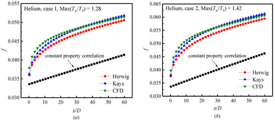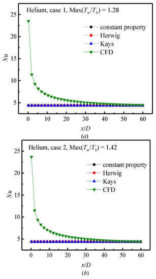 As shown in Table 3, the Nu number and f of laminar flow and heat transfer for three gases are calculated using Kays and Herwig correlations. The constant property correlations are also introduced for comparison. The applicability of existing variable property correlations to different gases are evaluated by comparing with CFD simulation results. The simulated local Nu number and f of gases are obtained by the following Equations (1) and (2), where λ denotes the cross-section average thermal conductivity, τw denotes the local wall shear and ub denotes the average velocity.