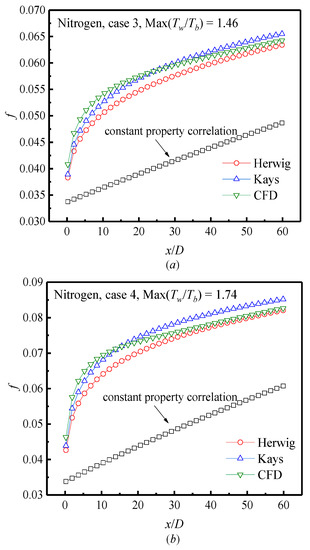 Calculations by existing f correlations for nitrogen. (a) case 3; (b) case 4.