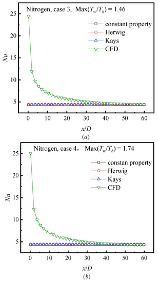 Calculations by existing Nu correlations for nitrogen. (a) case 3; (b) case 4.