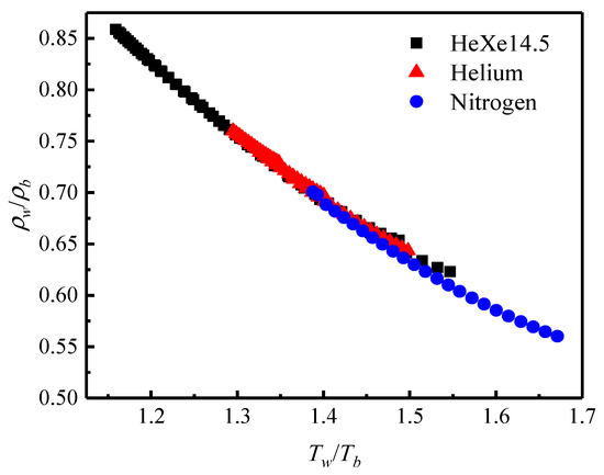 Variation of ρw/ρb with Tw/Tb for He–Xe.