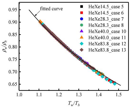 Equation (3) is in the form of property ratios, which is difficult to be directly applied to engineering problems. Although Herwig subsequently tried to establish a simplified correlation with the temperature ratio correction, only the experimental data of air with a reference temperature of 20 °C was used in the actual formula fitting, which limited the application range of the simplified correlation. In terms of calculation accuracy, Herwig’s simplified correlation is actually not good for He–Xe laminar f calculation. From Table 6, it can be seen that the Herwig’s simplified laminar f correlation has a prediction error of more than 13% for He–Xe in the fully-developed region. Therefore, it is still necessary to propose a more applicable laminar f correlation for He–Xe. Since the property ratio of He–Xe show an obvious relationship with Tw/Tb, the function between the property ratio and the temperature ratio can be fitted to obtain a modified f correlation. As shown in Figure 11, the variation of density ratio with Tw/Tb for He–Xe under different cases is firstly calculated. It is found that the ρw/ρb of He–Xe is almost independent of the gas mixing ratios, but only varies with Tw/Tb. By numerically fitting the data points, the expression of ρw/ρb for He–Xe can be obtained:
