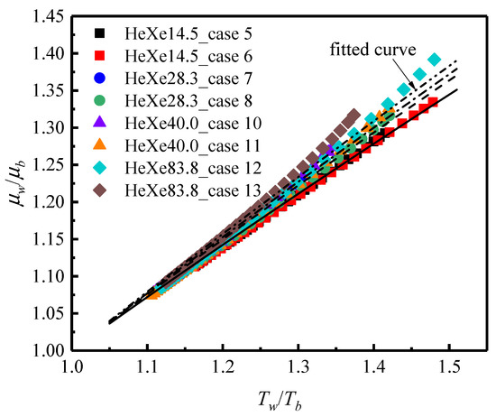 As shown in Figure 12, the μw/μb of He–Xe is related to Tw/Tb, the mixing ratio x1 and the heat flux q. When Tw/Tb is small, μw/μb is basically not affected by x1 and q. However, when Tw/Tb is large, μw/μb changes slightly with x1 and heat fluxes, which is mainly caused by the fact that the viscosity of He–Xe does not vary monotonously with the x1 and temperature. Since the deviation caused by different heat fluxes is small in the range of 0 < x1 < 0.30 (4.003 < M < 42.5), the influence of x1 and Tw/Tb on the μw/μb can be considered for simplification. By fitting the data points, the expression of μw/μb for He–Xe can be obtained as follows: