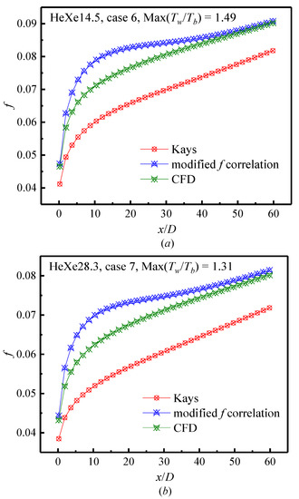 As shown in Table 11 and Table 12, the calculation accuracy of the new f correlation for He–Xe laminar flow is presented. The calculation error is found to be less than 3% for Δx/D ≥ 46.2, indicating that the new f correlation has good applicability to the laminar f calculation for property-variable He–Xe in the fully developed region.