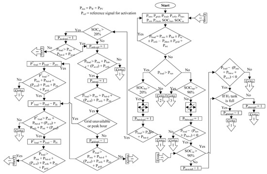 The principal purpose of supervisory control is to provide continuous and reliable power to all the connected loads. The loads used in this research work are residential load () and CS load (). The significant power is transmitted to these main loads. However, the excess power during off-peak hours is transmitted to BSS and SC for storing purposes and later use. The electrolyzer also acts as a load and obtains power from the DC-bus of SMG-HPS. The supervisory control enforces the use of renewable energy to entertain loads and store electrical power in various storing devices. However, in the case of a deficit power, the extra power is obtained from BSS, SC, and CS (PHEVs).