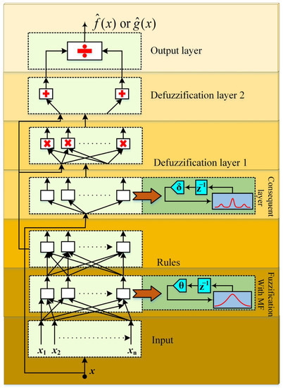 The schematic of NNQLNF is given in Figure 3. It consists of two parts: the QEN network, that estimates , and the FRNF architecture, that tunes the parameters. The QEN comprises a BP NN for estimation purpose, while the FRNF is an intelligent identifier discussed in Section 6 and Section 7. Three different FRNF architectures are used as FPT, and, thus, three distinct hybrid adaptive FQL embedded FRNF control paradigms are derived, which are used in this research work.