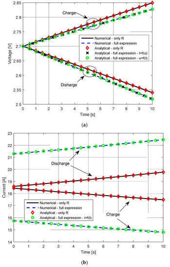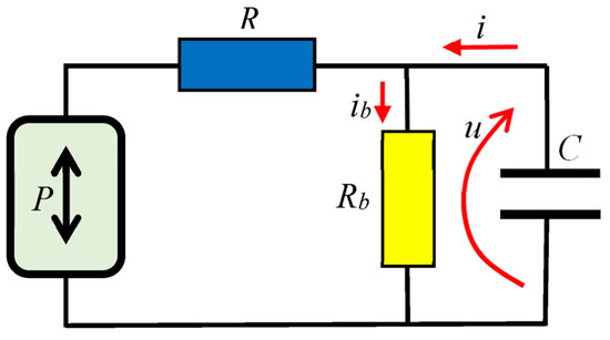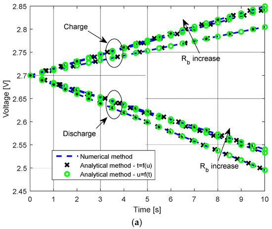 Furthermore, a comparison of the current-time and voltage-time characteristics obtained by applying the derived expressions with the corresponding characteristics obtained by ignoring the effect of the parallel resistance (i.e., considering Rb →∞) is shown in Figure 4. In this case, it is assumed that the value of parallel resistance is minimal, to provide a much more apparent impact on the characteristics. The characteristics obtained by applying the expressions t = f(u) and u = f(t) are also shown for voltage-time characteristics.