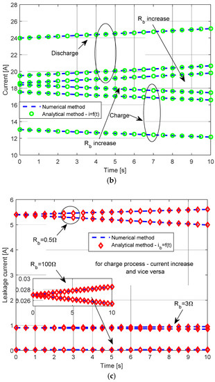 Finally, the impact of consecutive modifications to the SC’s charging and discharging power on voltage-time, current-time, and leakage-current-time characteristics were examined. The corresponding graphs are shown in Figure 10. In order to clearly observe the effect of the parallel resistance, it was set to a small value (Rb = 1 ohm).