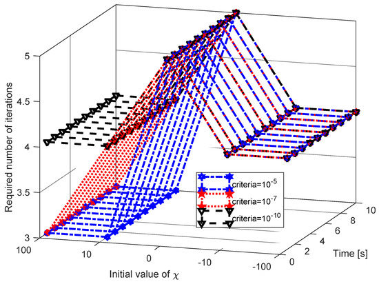 In order to check the influence of the initial conditions on the speed of convergence of the Newton method, the calculation results were repeated for five different initial condition values (–100, –10, 0, 10, and 100). Moreover, the convergence rate was tested for three different values of the convergence criteria: 10−5, 10−7, and 10−10. The criterion is defined as the absolute value of the difference between two neighboring variable values during the iterative process. This test was done for the case of the results shown in Table 2 (SC discharge, discharge power is 50 W, parallel resistance is 10 Ω). Figure 5 shows the influence of the initial conditions on the speed of convergence of the Newton method and the number of iterations in the problem solved.