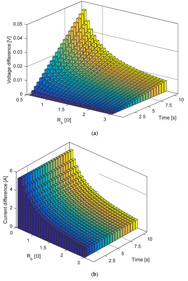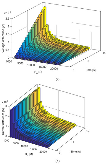 Seeking additional validation, the impact of the parallel resistance Rb value on the voltage-time and current-time characteristics is also analyzed using a 3D graph presented in Figure 6 and Figure 7 for small and large values of Rb, respectively, during the charging process. These figures illustrate the differences in voltages and currents calculated using the full expression derived in this paper and the Calasan et al. method [27] with infinite parallel resistance value.