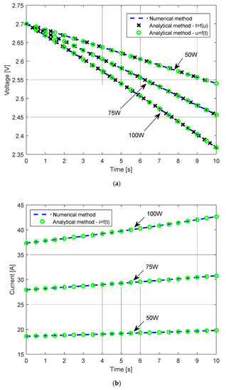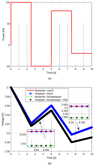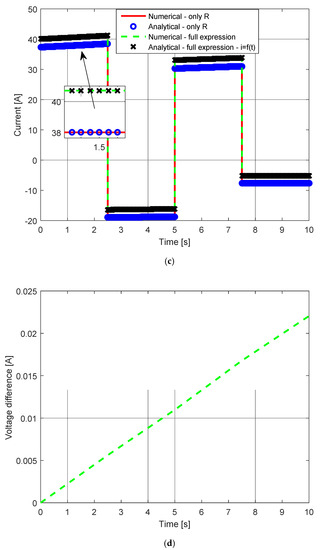 Results obtained by using the derived expressions and those obtained by using the expressions presented in [27]: (a) successive power changes versus time; (b) voltage versus time; (c) current versus time; (d) difference between voltage calculated using the methods investigated; C = 1200 F, Rb = 1 Ω, and R = 0.58 mΩ.