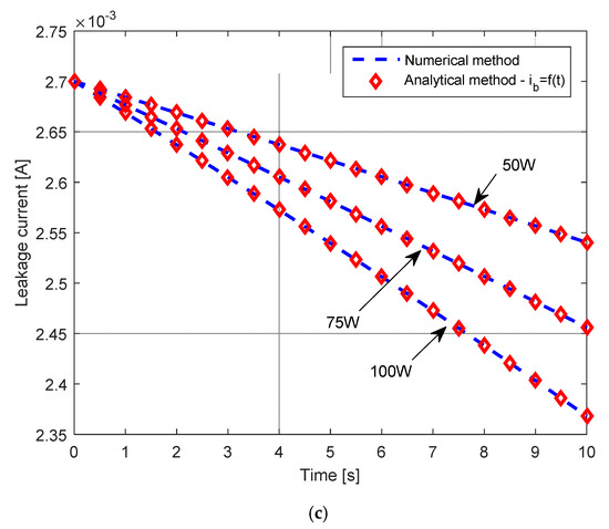 Additionally, the impacts of the parallel resistance value on the current, voltage, and leakage current are visualized in Figure 3 for different parallel resistance values, in which the results determined using the expressions proposed in this study are compared with corresponding ones determined using numerical integration, with integration step size 10−5. For such comparison, the following set of differential equations was used: