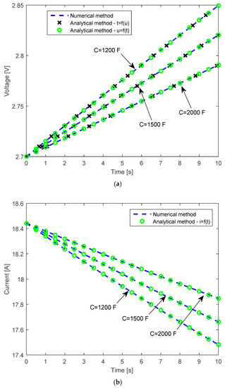 One can draw several conclusions based on the results in Table 2, Table 3, Table 4 and Table 5. Namely, the values of the coefficient are close to 1. The coefficient values in the discharging process (or coefficient in the charging process) are very close and only differ by some decimals; however, this difference greatly affects the value of in the discharging process (or the value of X in the charging process). Accordingly, even a small change in or values could dramatically impact the voltage and current values of SCs.