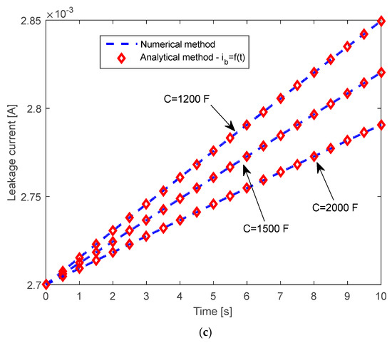 The impact of capacitance on voltage-time, current-time, and leakage current-time characteristics in the charging mode of the SC is shown in Figure 9. A higher capacitance value defines a slower voltage and leakage-current-value growth and slower current decrease.