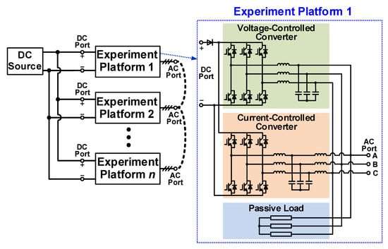 Figure 2. The proposed emulation approach is composed of several experiment platforms, and the power circuits of all experiment platforms are the same. Each experiment platform is composed of a voltage-controlled converter, a current-controlled converter, and passive loads. Every experiment platform interfaces with other components through the DC port and AC port. The DC port is used for the power supply, and thus, is connected to the DC source. The AC port can be connected to other experiment platforms for the test of microgrids with more complex configurations. The LC filter is adopted to regulate the output voltage of the voltage-controlled converter, and the LCL filter is adopted to regulate the output current of the current-controlled converter. Since both the PCC voltage and PCC current are related to the control behaviors in a microgrid, two converters are face-to-face connected to regulate the AC voltage and AC current simultaneously. The passive load is a common type of load in the microgrid, and thus, the actual passive loads are also used to recreate the control behaviors related to the passive loads. These two converters are powered by a common DC source. Since the power is circulated between two converters, only the power losses of the converters and the passive load need to be supplied by the DC source.