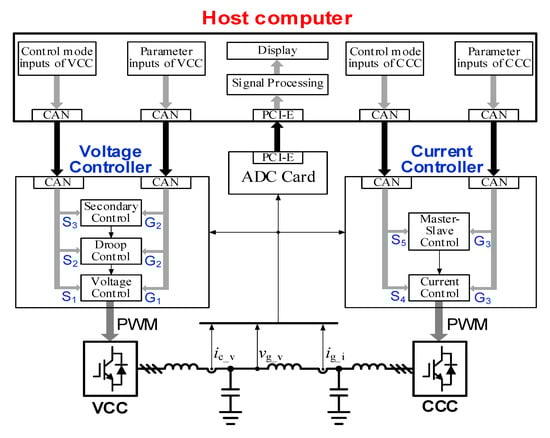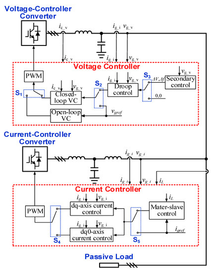 Figure 3, two controllers, which include a number of optional control schemes, are adopted for the voltage-controlled converter and the current-controlled converter. On one hand, when the control schemes in the current-controlled converter are under test, the voltage-controlled converter is used to emulate the voltage in the microgrid. On the other hand, the current-controlled converter needs to emulate the active load in order to test the control schemes in the voltage-controlled converter under different loads. Therefore, the different control schemes can be tested by selecting different control systems in different converters. Different types of control schemes can run or stop by selecting the switches, which enables an easy and intuitive comparison among different control schemes. The voltage controller is adopted in the voltage-controlled converter. The switch S