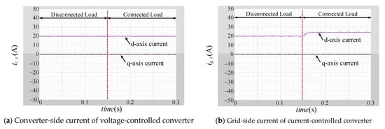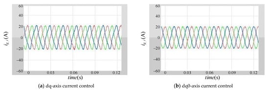 The output current of the current-controlled converter under different current control schemes when idref is 20 A. (a) dq-axis current control; (b) dq0-axis current control.