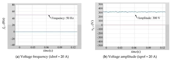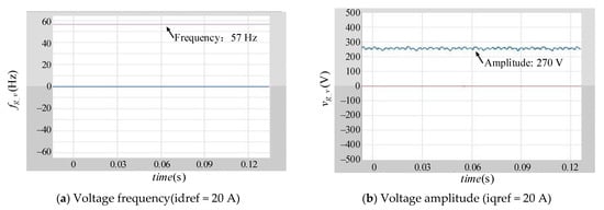 The frequency and amplitude of output voltage under droop control (f0 = 50 Hz, V0 = 300 V). (a) Voltage frequency (idref = 20 A); (b) Voltage amplitude (iqref = 20 A).