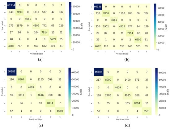Proposed approach results with four distinct mechanisms. (a) Confusion matrix of ensemble model with P7C mechanism. (b) Confusion matrix of ensemble model with P7U mechanism. (c) Confusion matrix of ensemble model with P6C mechanism. (d) Confusion matrix of ensemble model with P6U mechanism.