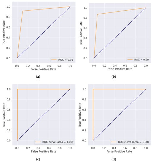 Assessing the quality of a machine-/deep-learning algorithm is crucial to any investigation’s success. Metrics used for evaluation determine how well a machine-learning or deep-learning model performs. It is possible to put a model through its paces using any one of a wide variety of evaluation measures. Accuracy, precision, recall, the F-measure, the AUC score, and the confusion matrix are all taken into account, as well as a few others that are often used to evaluate performance in this study, as shown in Equations (4)–(7). Results such as true positives (TP), true negatives (TN), false positives (FP), and false negatives (FN) can be determined by examining the resulting confusion matrices. Values for accuracy, precision, recall, and F-measure, can be calculated using the below equations: