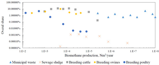 Figure 2 shows the share of all sources of various sizes in the total production of biomethane in Poland. The available sources have capacities ranging from hundreds to tens of millions Nm3/year. The smallest available source, with a capacity of 150 Nm3/year, comes from poultry farming in henhouses with 1 to 50 hens. There are over 300,000 such henhouses in Poland.