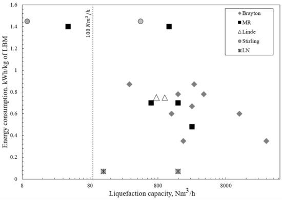 The liquefaction of biomethane simplifies its storage and transport. The review work [73] has compared the available market solutions for biomethane liquefaction and its summary is presented in Figure 3. The current market has a limited offer in the case of a liquefaction capacity below 100 Nm3/h of biomethane. The available technologies below 100 Nm3/h are characterized by high energy consumption per unit of LBM exceeding 1.2 kWh/kg and in the case of Stirling liquefiers, it can also be expensive. An additional solution that can be adjusted to a capacity below 100 Nm3/h is liquefaction through liquid nitrogen (LN). Most of the energy consumption of this technology is included in the price of LN.