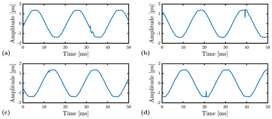 (a–d) Example of four acquired power grid voltage normalized segments. Each segment has 625 acquired samples with 16-bit DAQ at 12.5 kS/s, which corresponds to segments with 50 ms. The four examples highlight the difference in transient amplitudes, durations and relative phase locations.