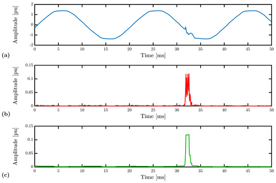 Transient detection was performed by a threshold analysis of the closing operation results (in this paper, a 0.1 pu threshold was considered). If the closing operation results exceeded the pre-defined threshold, a transient was considered detected. The transient amplitude was the maximum of the closing operation, and the transient duration was estimated by the time interval between the first and second interceptions of the closing operation results, with the threshold value using interpolation. For the example in Figure 2, the transient had a 0.119 pu amplitude and 0.72 ms duration. Notice that the harmonic distortions in Figure 2a were present at the filter output, as shown in Figure 2b, but they were not enough to trigger the transient detection process.