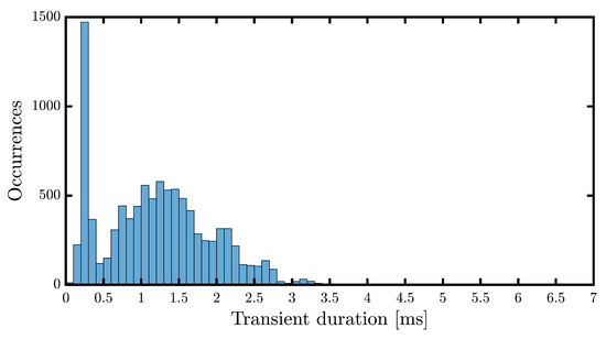 Transient duration histogram of the recorded transient database. The duration was obtained by interpolation of the instances where the closing operation crossed the threshold value.