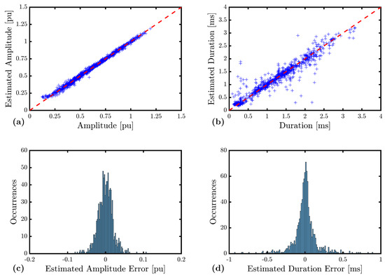 The root-mean-square error (RMSE) of the transient amplitude, as obtained using the benchmark values from the filter and closing morphology algorithm, was , and the average error was . As for the transient duration, the RMSE was , and the average error was . The estimated amplitude error interval pu was based on 95% of the situations shown in Figure 10. For the estimated duration error, the corresponding 95% interval was ms. These results again highlighted that the proposed method could achieve better results when estimating the transient amplitude, as compared to the estimated transient duration.