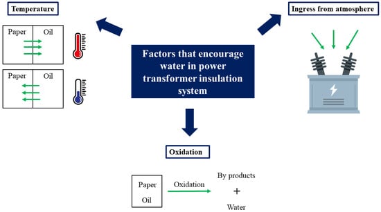 As an essential equipment in an electrical power system, a power transformer undergoes a complicated manufacturing process to meet a high-standard design. Therefore, special attention must be given to the drying process during manufacturing, as it is one of the most critical processes to remove excessive water contaminants from the paper insulation [15]. The transformers are dried during manufacturing with a standard practice of achieving a WCP of at less than 1.0% [16]. However, the water content of the insulation system continually increases after initial drying. One of the factors is mainly due to the ingress from the atmosphere, especially during maintenance activities where the solid insulation is exposed to the air. Furthermore, water migration between oil and paper occurs during transformer operation as the temperature changes. The water from the oil migrates to the cellulose papers when the temperature decreases. In contrast, increasing temperature leads to the migration of water from cellulose papers to the oil. Additionally, the aging of cellulose and oil, predominantly from the oxidation process, also contributes to the water content [21,22]. Figure 2 shows the factors that generate water into the transformer insulation system.