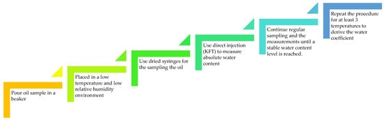 Since the water saturation for new and aged oil is different, it is important to know the oil solubility coefficients for each investigated transformer oil. Many efforts have been made to develop the formula to find the oil solubility coefficients. A study by [50] described a method to determine the coefficients A and B that consists of conditioning the electro-insulating liquid in a tightly closed vessel at three different temperature values. The oil parameters such as water content, RS, and temperature are measured for each temperature value after moisture equilibrium is achieved. The measurement procedure adopted from [50] is summarized in Table 4.