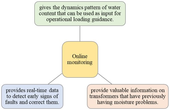 Currently, many commercially available saturation meter-based sensors have been used for an online monitoring method for power transformers. Online measurement of the WCO of the transformer can significantly reduce errors due to transportation to the lab and titration and accurately trace water content variations [41]. Another effective use of online monitoring is depicted in Figure 5.