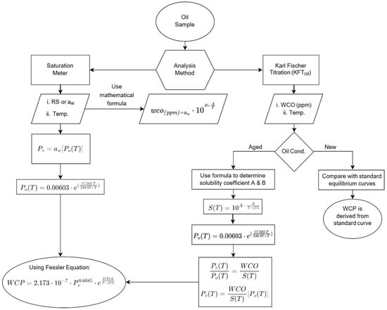 We summarized the determination of WCP in a flowchart in Figure 8. The WCP obtained by mathematical formula can be used to construct a new equilibrium curve based on an RS or aw measurement. Based on the flowchart, we can conclude that the accuracy of using RS or aw measurements compared to KFToil is due to the Pv value that can be determined directly by using the readily measured RS or aw from the probe’s reading.