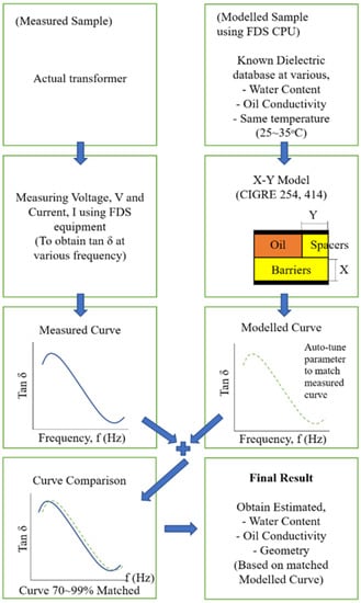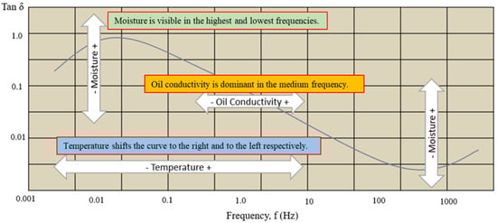 The dielectric response method is another indirect technique to determine insulation paper water content. This technique overcomes the limitations of the moisture equilibrium curve for estimating water content in insulation paper, such as the need to use the correct moisture equilibrium curve for aged oils. It is also important to determine the water content at different operating temperatures under stable conditions, which is impossible to achieve. Therefore, measurement based on dielectric response is currently used domestically and internationally since the measurement is temperature dependent [75]. This technique is performed by measuring the effects of water on electrical properties based on the fact that paper and oil change their dielectric properties when water levels increase [76,77]. The dielectric response techniques measure the dielectric properties as a function of frequency or time. These techniques measure the impedance of a system over a range of frequencies and reveal the dissipation properties. There are two types of dielectric response techniques: time-domain and frequency-domain [78].