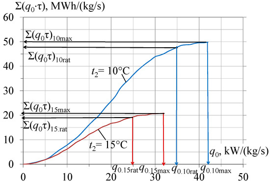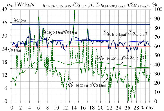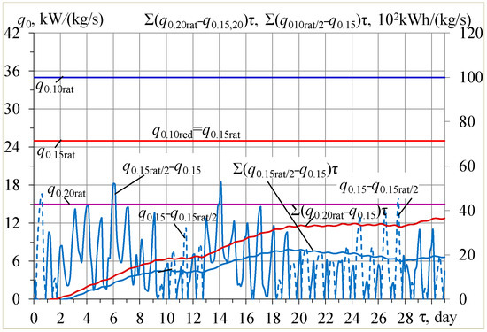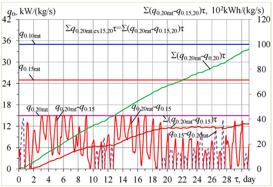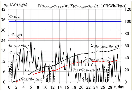 As Figure 9 shows, in the case of applying the value of the refrigeration capacity q0.10/2red = q0.15rat/2 instead of q0.10rat/2, id est, q0.15rat instead of q0.10rat as a design value, within nearly half of a month, the current values of deficit q0.15 − q0.15rat/2 are not covered by the actual values of the available exceedance q0.15rat/2 − q0.15 of the rational refrigeration capacity q0.15rat/2 above q0.15, leading to a reduction in the summarized curve ∑(q0.15rat/2 − q0.15)τ. However, the monthly exceedance of the refrigeration energy ∑(q0.15rat/2 − q0.15)τ = 2000 kWh/(kg/s) is much less than ∑(q0.20rat − q0.15)τ = 3500 kWh/(kg/s) (Figure 9).