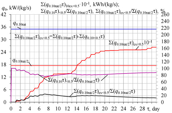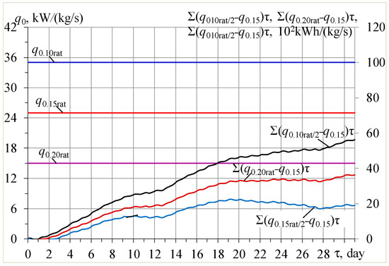 The continuously rising character of the available summarized exceedance of the refrigeration energy curve ∑(q0.10rat/2 − q0.15)τ demonstrates that the increased refrigeration capacity q0.10rat/2 compared to q0.20rat is able to cover its actual deficit q0.15 − q0.10rat/2 by the daily recouping of the reserved refrigeration energy ∑(q0.10rat/2 − q0.15)τ at lowered current heat loads q0.10, as well as with a significant monthly exceedance of 5600 kWh/(kg/s) (Figure 8).