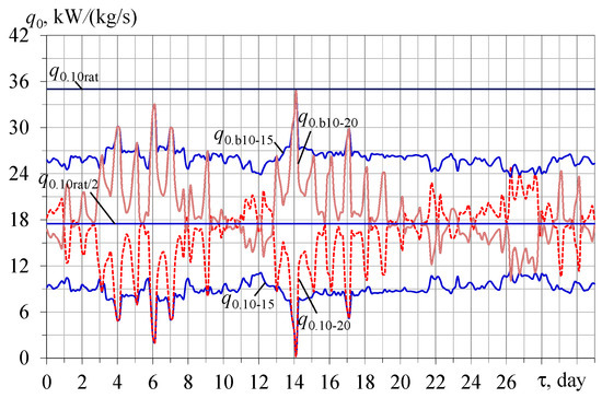 Meanwhile, proceeding from the use of q0.20rat as the design refrigeration capacity for conditioning outdoor air to 15 °C instead of q0.15rat (Figure 7), the overall design refrigeration capacity for conditioning outdoor air to 10 °C can be reduced to q0.10red = 25 kW/(kg/s) against q0.10rat = 35 kW/(kg/s), that is, by the value of the difference q0.15rat − q0.20rat = 10 kW/(kg/s) according to Figure 1. In reality, we can use q0.10red = q0.15rat. The results of the calculations are presented in Figure 9.