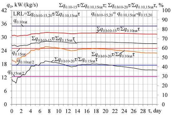 The following correlations are used: q0.10-15,20 = q0.10 − q0.15,20, q0.b10-15,20 = q0.10rat − q0.10-15,20; and the correlations for the developed criteria are: LRL = ∑(q0.b10-15,20τ)/∑(q0.10ratτ), 1 − LRL = ∑(q0.10-15,20τ)/∑(q0.10ratτ).