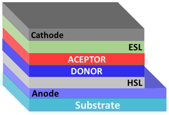 In 1986, C. Tang demonstrated the first bilayer organic solar cell [16]. As a result of the layer-by-layer deposition of electron donor (copper phthalocyanine) and electron acceptor (perylenediimide derivative) materials, the so-called lateral p-n heterojunction was formed. The presence of such a heterojunction made it possible to obtain the device with a record (for that time) PCE of about 1%. Note that, in general, the structures of all photovoltaic cells with a lateral heterojunction include an anode, a hole-selective layer (HSL), layers of electron donor and electron acceptor materials, an electron-selective layer (ESL), and a cathode (Figure 2).