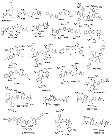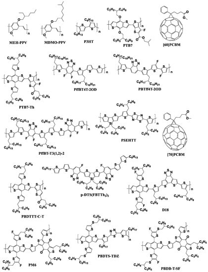 Information on the use of the fullerene derivatives with reduced electron affinity as electron acceptor materials for organic solar cells will be summarized and analyzed further in this review. Figure 9 shows the molecular structures of the p-type semiconductor materials that were used in photovoltaic cells in combination with the fullerene derivatives considered in this review.