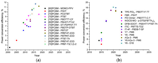 Thus, significant progress has been made in the design of new p-type semiconductor materials, especially conjugated polymers, delivering power conversion efficiencies of 10–12% in OSCs using fullerene-based acceptor materials (Figure 6 and Figure 7) [22,28,45,47,48,49,50,51,52,53,54,55,56,57,58,59,60,61,62].