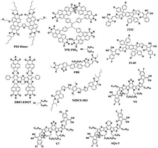A further increase in the efficiency of OSCs up to the current ~18% has mainly been associated with the development of new non-fullerene acceptor (NFA) materials with tailored properties. To date, it has been possible to produce OSCs with PCE going beyond 18% using such NFAs as Y6 and AQx-3 [10,63]. Figure 8 shows the molecular structures of some NFAs that have proven to be promising n-type semiconductor materials for the high-efficiency OSCs [64,65,66,67,68,69,70,71].