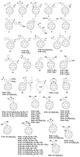 In 2016, Matsumoto et al. studied the effect of the polarity of fullerene derivatives on the efficiency of the corresponding OSCs using P3HT polymer [106]. It was shown that the photovoltaic cells based on fullerene derivative 29 demonstrated the highest efficiency. Note that the introduction of two methoxyl groups into the positions of 2 and 6 of the phenyl substituent, which are in close proximity to the fullerene core, increased the LUMO energy of the compound in comparison with that of [60]PCBM.
