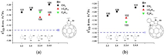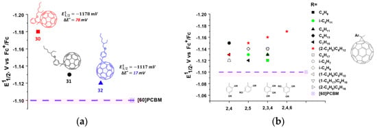 (a) Dependence of the first reduction potentials (E11/2) obtained in solution on the position of the alkoxy substituent in the phenyl ring of methanofullerenes 30–32; (b) The effects of the positioning and number of alkoxy substituents in the phenyl fragment on reduction potentials of methanofullerenes.