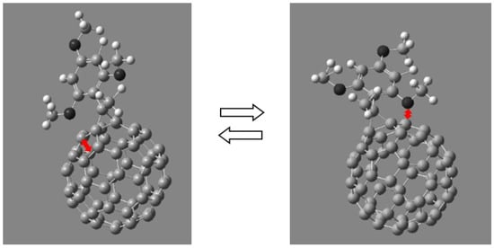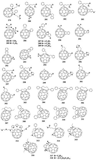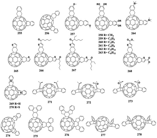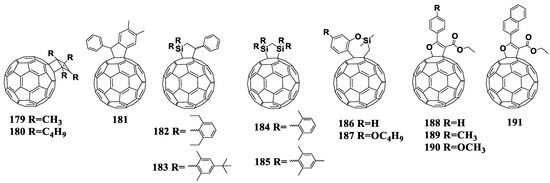 A common method for introducing a cyclopropane fragment at the fullerene cage is the Hummelen–Woodle method, which is the reaction of fullerenes with diazo compounds generated in situ from tosylhydrazones of aromatic aldehydes or ketones using sodium methoxide [37]. As a result of the reaction, fulleroid with an open 6-5 bond is first formed, which then isomerizes at a temperature of 180 °C to form a closed methanofullerene. The application of the Hummelen–Woodl method is limited by the formation of side products such as polyadducts, when the organic addend is attached to the fullerene framework several times, which must be carefully separated from the target fullerene derivative (monoadduct). Figure 10 shows the molecular structures of the fullerene derivatives in which the organic addend is attached to the fullerene framework through the cyclopropane fragment.