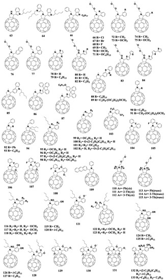 Yoshimura et al. studied 2,5-diarylpyrrolidinofullerenes (compounds 110–115) as an acceptor material [127]. The first reduction potentials of the compounds were slightly shifted to the cathodic region versus [60]PCBM. Among all the studied diarylpyrrolidinofullerenes the device based on the 113/P3HT composite showed the best parameters.