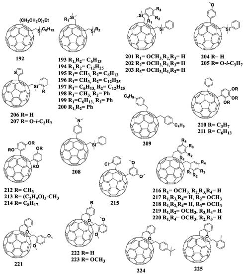 Another approach to modifying the [60]PCBM molecule is to replace the ester group with alkyl residue. An example is compound 8 in which the electron-donating alkoxy group in the para-position of the phenyl ring affects the electronic properties of the molecule [89].